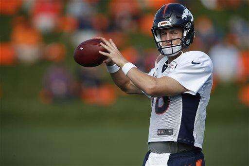 In this Wednesday, Aug. 19, 2015, photograph, Denver Broncos quarterback Peyton Manning takes part in drills at the team's NFL football training camp session in Englewood, Colo. The Broncos are preparing to host the Pittsburgh Steelers in a second-round AFC playoff game Sunday, Jan. 17, 2016, in Denver. (AP Photo/David Zalubowski) The Associated Press