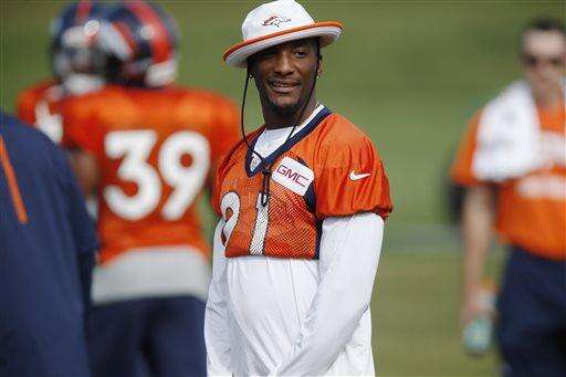 In this Wednesday, Aug. 19, 2015, photograph, Denver Broncos cornerback Aqib Talib looks on during drills at the team's NFL football training camp session in Englewood, Colo. The Broncos are preparing to host the Pittsburgh Steelers in a second-round AFC playoff game Sunday, Jan. 17, 2016, in Denver. (AP Photo/David Zalubowski) The Associated Press