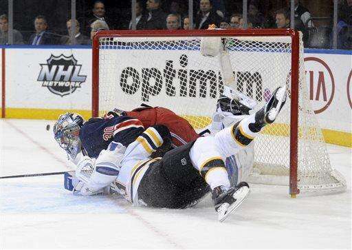 New York Rangers' goaltender Henrik Lundqvist, right, of Sweden, makes a save on a shot by Boston Bruins' Loui Eriksson (21) as he is checked by Rangers Dan Girardi during the first period of an NHL hockey game Monday, Jan. 11, 2016, at Madison Square Garden in New York. (AP Photo/Bill Kostroun) The Associated Press