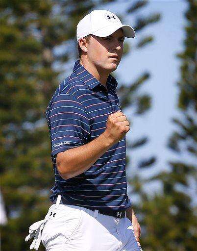 Jordan Spieth pumps his fist after making his birdie putt on the second green during the final round of the Tournament of Champions golf tournament, Sunday, Jan. 10, 2016, at Kapalua Plantation Course on Kapalua, Hawaii. (AP Photo/Matt York) The Associated Press