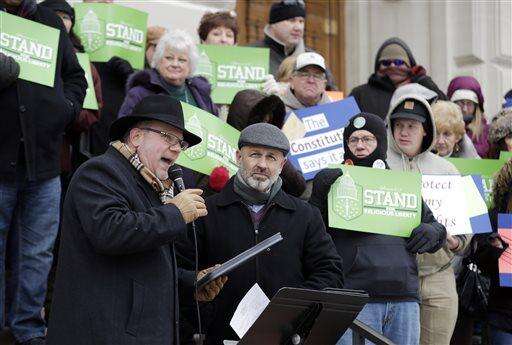 Dr. Ron Johnson, right, holds petitions as he speaks during a rally by the Indiana Pastors Alliance outside of the Statehouse, Wednesday, Jan. 13, 2016, in Indianapolis. The group presented petitions against proposals being considered by legislators that would extend state civil rights protections to include sexual orientation and gender identity. Dr. Kevin Baird is at left. (AP Photo/Darron Cummings) The Associated Press