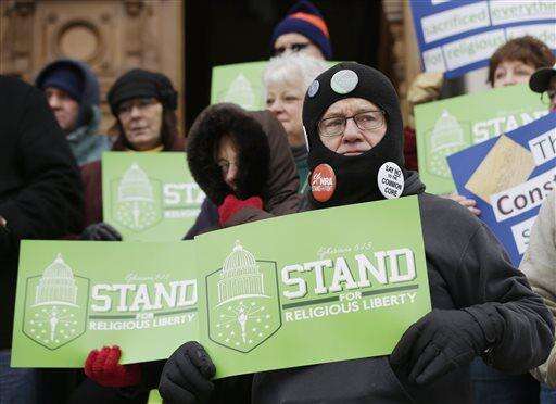 A protestors holds a sign during a rally by the Indiana Pastors Alliance outside of the Statehouse, Wednesday, Jan. 13, 2016, in Indianapolis. The group presented petitions against proposals being considered by legislators that would extend state civil rights protections to include sexual orientation and gender identity. (AP Photo/Darron Cummings) The Associated Press