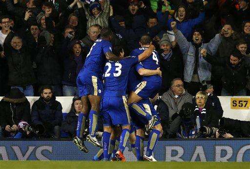 Leicester City’s Robert Huth is mobbed by his teammates after scoring the only goal of the game during their English Premier League soccer match between Tottenham Hotspur and Leicester City at the White Hart Lane stadium in London Wednesday, Jan.13, 2016. Leicester City won the match 1-0. (AP Photo/Alastair Grant) The Associated Press