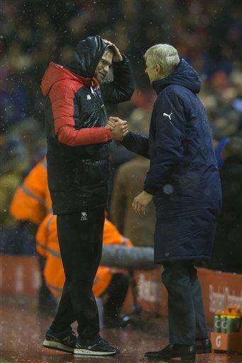 Liverpool's manager Juergen Klopp, left, shakes hands with Arsenal's manager Arsene Wenger after their team's 3-3 draw in the English Premier League soccer match between Liverpool and Arsenal at Anfield Stadium, Liverpool, England, Wednesday, Jan. 13, 2016. (AP Photo/Jon Super) The Associated Press