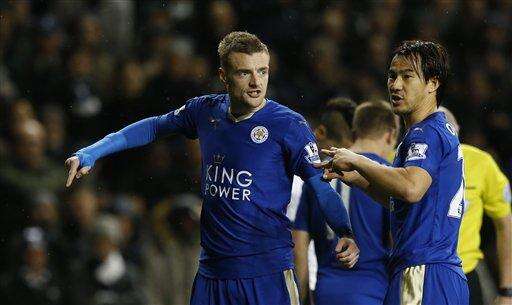 Leicester City’s Jamie Vardy, left, and teammate Shinji Okazaki organise the defence during their English Premier League soccer match between Tottenham Hotspur and Leicester City at the White Hart Lane stadium in London Wednesday, Jan. 13, 2016. (AP Photo/Alastair Grant) The Associated Press