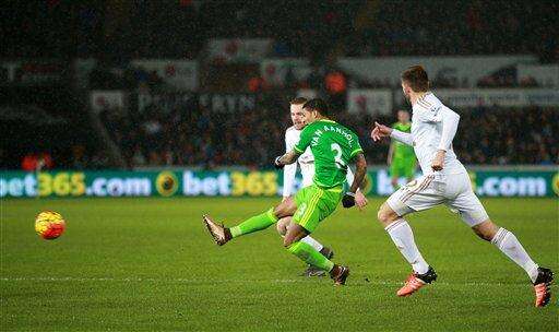 Sunderland's Patrick van Aanholt scores against Swansea City during the English Premier League soccer match at the Liberty Stadium, Swansea, Wales, Wednesday Jan. 13, 2016. (David Davies/PA via AP) UNITED KINGDOM OUT The Associated Press