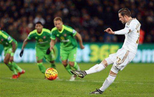 Swansea City's Gylfi Sigurdsson scores their first goal of the game against Sunderland from the penalty spot during their English Premier League soccer match at the Liberty Stadium, Swansea, Wales, Wednesday, Jan. 13, 2016. (David Davies/PA via AP) UNITED KINGDOM OUT - NO SALES - NO ARCHIVES The Associated Press