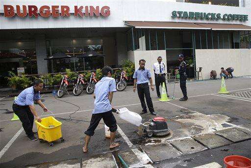 Workers clean up the spot where the militants involved in Thursday's attack were killed in Jakarta, Indonesia, Saturday, Jan. 16, 2016. Indonesian police said Saturday they have arrested a number of people suspected of links to the audacious attacks by suicide bombers and gunmen on Thursday in central Jakarta, the first major assault by militants in Indonesia since 2009. (AP Photo/Tatan Syuflana) The Associated Press