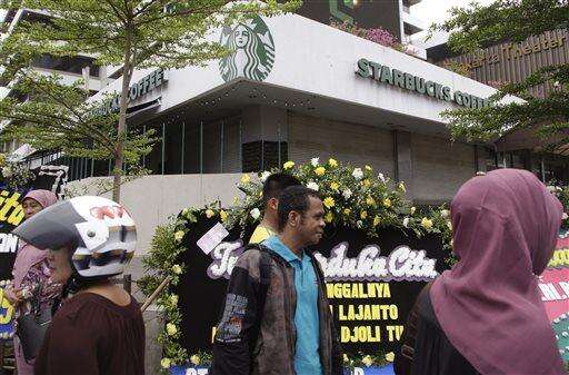 People gather outside the Starbucks cafe where Thursday's attack took place in Jakarta, Indonesia, Saturday, Jan. 16, 2016. Indonesian police said Saturday they have arrested a number of people suspected of links to the audacious attacks by suicide bombers and gunmen on Thursday in central Jakarta, the first major assault by militants in Indonesia since 2009. (AP Photo/Tatan Syuflana) The Associated Press