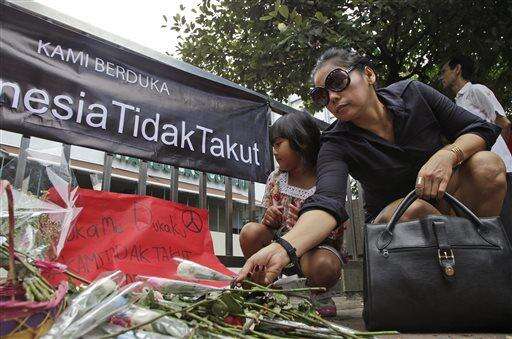 A woman lays flower outside the Starbucks cafe where Thursday's attack took place in Jakarta, Indonesia, Saturday, Jan. 16, 2016. Indonesian police said Saturday they have arrested a number of people suspected of links to the audacious attacks by suicide bombers and gunmen on Thursday in central Jakarta, the first major assault by militants in Indonesia since 2009. Writings on the banner read "Indonesia is not afraid." (AP Photo/Tatan Syuflana) The Associated Press