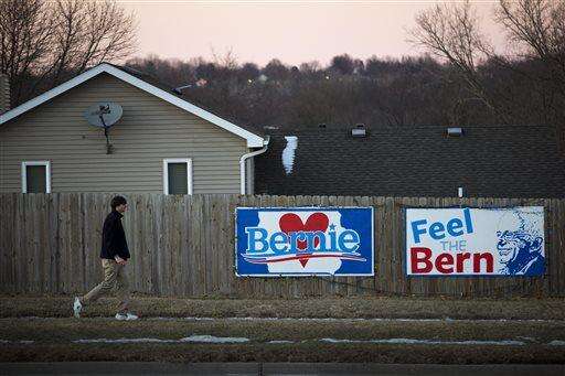 A man walks past signs supporting Democratic presidential candidate Sen. Bernie Sanders, I-Vt., Friday, Jan. 15, 2016, in West Des Moines, Iowa. (AP Photo/Jae C. Hong) The Associated Press