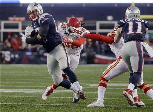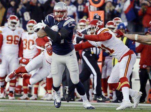Patriots defensive lineman Chandler Jones forced Knile Davis' fumble on the Chiefs' first possession of the second half, then Brady added another touchdown pass to Gronkowski to make it 21-6.