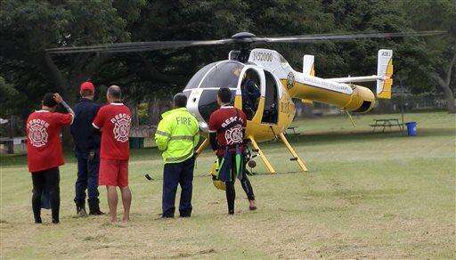Fire Department rescue personnel stand near a department helicopter near the beach at Haleiwa, Hawaii, Friday, Jan. 15, 2016. Two Marine helicopters carrying 12 crew members collided off the island of Oahu during a nighttime training mission, and rescuers are searching a debris field in choppy waters, military officials said. (AP Photo/Audrey McAvoy) The Associated Press