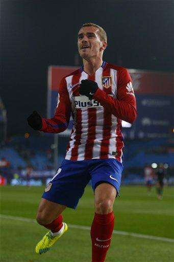 Atletico Madrid's Antoine Griezmann celebrates after scoring his team's third goal against Rayo Vallecano during the Copa del Rey second leg soccer match between Atletico Madrid and Rayo Vallecano at the Vicente Calderon stadium, in Madrid, Thursday, Jan. 14, 2016. Atletico Madrid won 4-1 on aggregate and moved to the next round. (AP Photo/Francisco Seco) The Associated Press