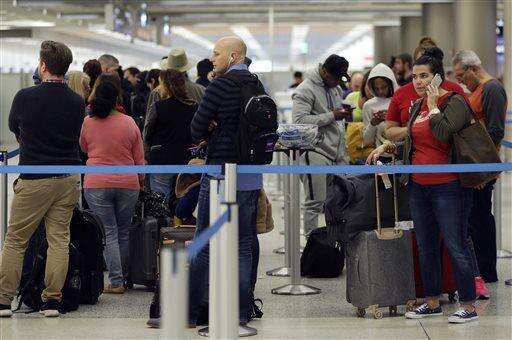 NEW YORK (AP) - Airlines canceled around 7,600 flights to, from or within the U.S. for Friday and Saturday, as a blizzard began covering much of the Eastern U.S.