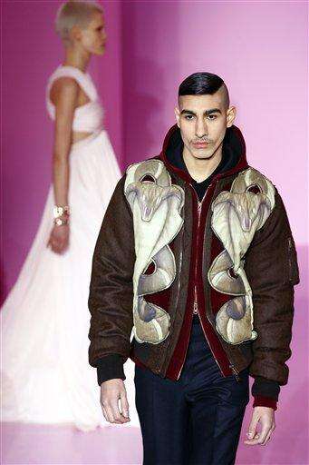 A model wears a creation by Italian designer Riccardo Tisci as part of Givenchy men's Fall-Winter 2016/2017 fashion collection presented in Paris, France, Friday, Jan. 22, 2016. (AP Photo/Francois Mori) The Associated Press