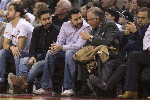 Alex Anthopoulos, center left, recently named vice president of baseball operations for the Los Angeles Dodgers, chats to Post Media's CEO Paul Godfrey, center right, as the Toronto Raptors take on the Miami Heat during an NBA basketball game Friday, Jan. 22, 2016, in Toronto. (Chris Young/The Canadian Press via AP) The Associated Press
