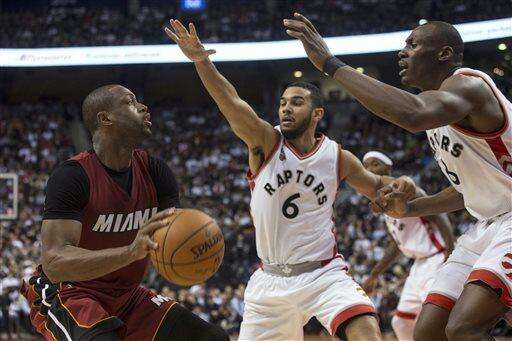 Miami Heat's Dwyane Wade, left, looks to pass as Toronto Raptors' Corey Joseph (6) and Bismack Biyombo defend during the second half of an NBA basketball game Friday, Jan. 22, 2016, in Toronto. (Chris Young/The Canadian Press via AP) The Associated Press