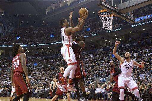 Toronto Raptors' DeMar DeRozan (10 ) scores over Miami Heat's Amare Stoudemire during the first half of an NBA basketball game Friday, Jan. 22, 2016, in Toronto. (Chris Young/The Canadian Press via AP) The Associated Press