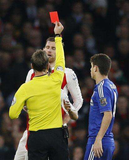 Arsenal's Per Mertesacker, centre, is shown a red card and sent off by referee Mark Clattenburg for a foul on Chelsea's Diego Costa during the English Premier League soccer match between Arsenal and Chelsea at the Emirates stadium in London, Sunday, Jan. 24, 2016.(AP Photo/Frank Augstein) The Associated Press