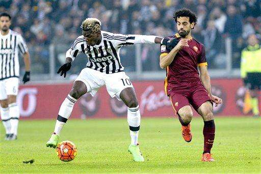 Juventus' Paul Pogba, left, challenges for the ball with Roma Mohamed Salah during a Serie A soccer match at the Juventus stadium, in Turin, Italy, Sunday, Jan. 24, 2016. (AP Photo/Massimo Pinca) The Associated Press