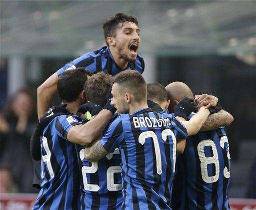 Inter Milan's Rodrigo Palacio, covered by his teammates, celebrates after scoring during the Serie A soccer match between Inter Milan and Carpi at the San Siro stadium in Milan, Italy, Sunday, Jan. 24, 2016. (AP Photo/Antonio Calanni) The Associated Press