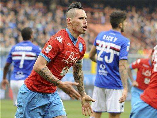 Napoli's Marek Hamsik celebrates after scoring during a Serie A soccer match between Sampdoria and Napoli at the Genoa Luigi Ferraris stadium, Italy, Sunday, Jan 24, 2016. (AP Photo/Carlo Baroncini) The Associated Press