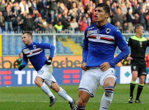 Sampdoria's Joaquin Correa celebrates after scoring during a Serie A soccer match between Sampdoria and Napoli at the Genoa Luigi Ferraris stadium Sunday, Jan 24, 2016 (AP Photo/Carlo Baroncini) The Associated Press