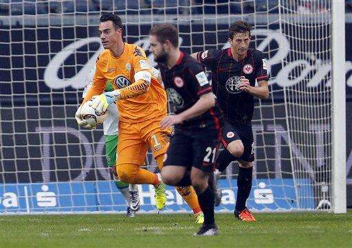 Frankfurt's Alexander Meier, 2nd left, scores the equalizing goal during a German Bundesliga soccer match between Eintracht Frankfurt and VfL Wolfsburg in Frankfurt, Germany, Sunday, Jan. 24, 2016. (AP Photo/Michael Probst) The Associated Press