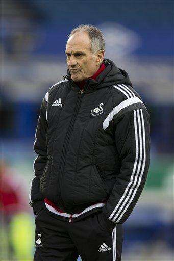Swansea Cityâs manager Francesco Guidolin watches his players warm up before the English Premier League soccer match between Everton and Swansea at Goodison Park Stadium, Liverpool, England, Sunday Jan. 24, 2016. (AP Photo/Jon Super)