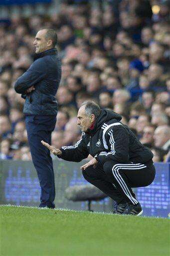 Swansea Cityâs manager Francesco Guidolin, right, is senn on the touchline alongside Everton's manager Roberto Martinez during the English Premier League soccer match between Everton and Swansea at Goodison Park Stadium, Liverpool, England, Sunday Jan. 24, 2016. (AP Photo/Jon Super)