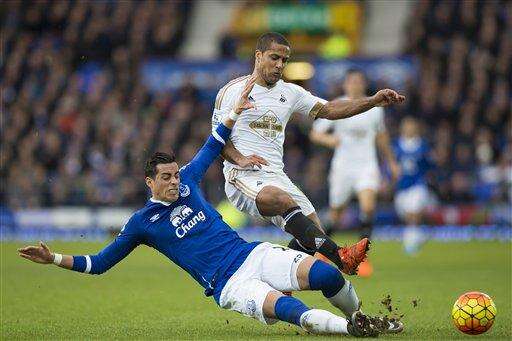 Everton's Ramiro Funes Mori, bottom, fights for the ball against Swansea's Wayne Routledge during the English Premier League soccer match between Everton and Swansea at Goodison Park Stadium, Liverpool, England, Sunday Jan. 24, 2016. (AP Photo/Jon Super)