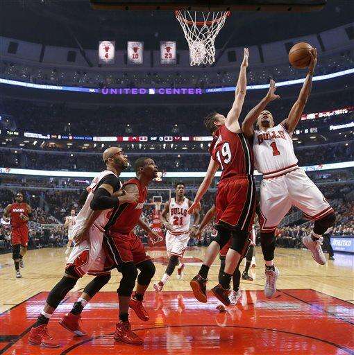 Chicago Bulls guard Derrick Rose (1) shoots over Miami Heat guard Beno Udrih (19) as Chris Bosh, center, blocks out Taj Gibson during the first half of an NBA basketball game Monday, Jan. 25, 2016, in Chicago. (AP Photo/Charles Rex Arbogast)