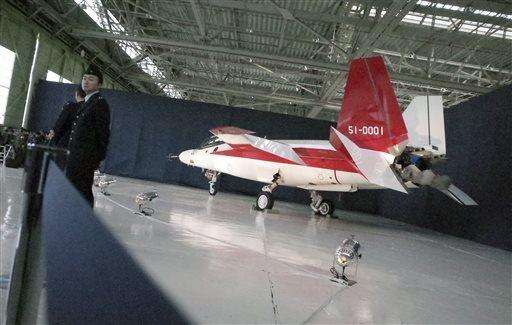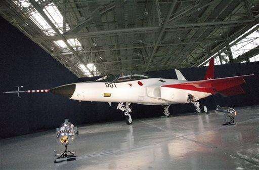 The first domestically-made stealth aircraft, X-2, is shown to the media at Nagoya Airport in Toyoyama town, central Japan, Thursday, Jan. 28, 2016. The demonstration plane is expected to make its maiden flight sometime after mid-February. A Defense Ministry official said the technology will give Japan the option of developing its own stealth fighter jets in the future. (AP Photo/Emily Wang)
