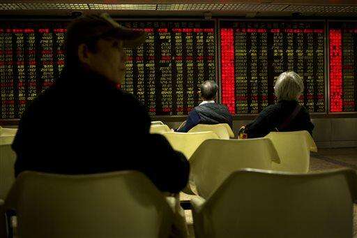 Chinese investors monitor stock prices on an electronic display in a brokerage house in Beijing, Thursday, Jan. 28, 2016. Asian stock markets wavered Thursday after the Federal Reserve sounded a note of caution on the world economy and its effect on U.S. growth but left the door open for rate hikes. (AP Photo/Mark Schiefelbein)