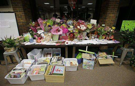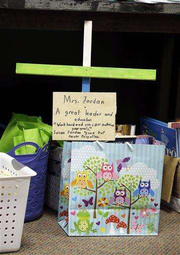 Cards, books and flowers honoring Susan Jordan, the principal of Amy Beverland Elementary School, are seen inside the entrance of the school, Friday, Jan. 29, 2016, in Indianapolis. Jordan was fatally struck by a school bus that unexpectedly lurched forward.  Jordan was killed and two 10-year old students were injured in what authorities believe was an accident. (AP Photo/Darron Cummings) The Associated Press