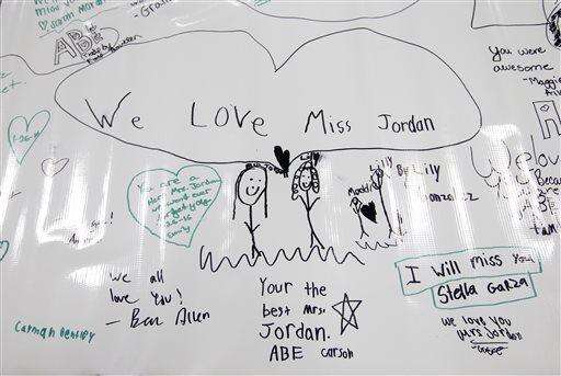 Handwritten notes honoring Susan Jordan, the principal of Amy Beverland Elementary School, are seen inside the entrance of the school, Friday, Jan. 29, 2016, in Indianapolis. Jordan was fatally struck by a school bus that unexpectedly lurched forward.  Jordan was killed and two 10-year old students were injured in what authorities believe was an accident. (AP Photo/Darron Cummings) The Associated Press
