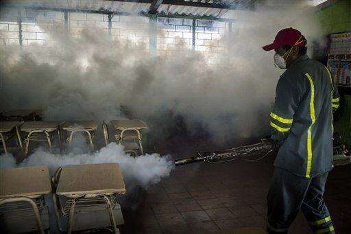 In this Jan. 28, 2016 photo, a city worker fumigates a classroom in a mosquito eradication effort to battle the insect blamed for spreading a virus suspected of causing birth defects, in Santa Tecla, El Salvador. While anyone can be bitten by the Aedes aegypti mosquito that transmits Zika, dengue, chikungunya and yellow fever, public health experts agree that the poor are more vulnerable because they often lack amenities that help diminish the risk, such as air conditioning and window screens. (AP Photo/Salvador Melendez) The Associated Press