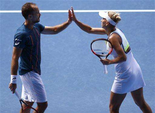 Elena Vesnina, right, of Russia and Bruno Soares of Brazil celebrate a point win over Coco Vandeweghe of the United States and Horia Tecau of Romania during the mixed doubles final match at the Australian Open tennis championships in Melbourne, Australia, Sunday, Jan. 31, 2016.(AP Photo/Rafiq Maqbool) The Associated Press