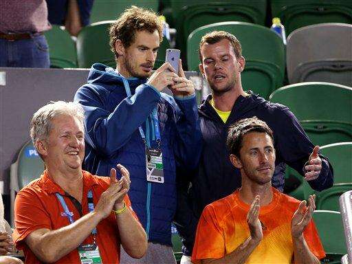 Andy Murray of Britain, top left, takes a picture of his brother Jamie Murray of Britain and Bruno Soares of Brazil in their men's doubles final against Daniel Nestor of Canada and Radek Stepanek of the Czech Republic at the Australian Open tennis championships in Melbourne, Australia, early Sunday, Jan. 31, 2016.(AP Photo/Rick Rycroft) The Associated Press