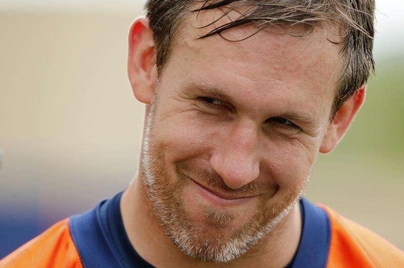 Denver Broncos tight end Owen Daniels smiles during an OTA Monday, June 15, 2015, in Englewood, Colo.