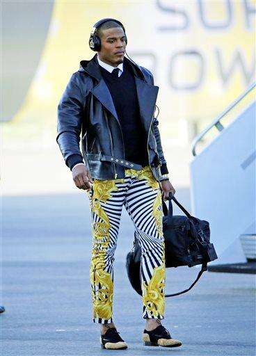 FILE - In this Jan. 31, 2016 file photo, Carolina Panthers quarterback Cam Newton gets off the plane at the Mineta San Jose International Airport in San Jose, Calif. The Panthers play the Denver Broncos on Sunday, Feb. 7, 2015, in Super Bowl 50. Newton was snapped Sunday in the zebra stripe, gold swirl rocker pants immediately setting social media and TV talking heads into a frenzy. (AP Photo/David J. Phillip, File) The Associated Press