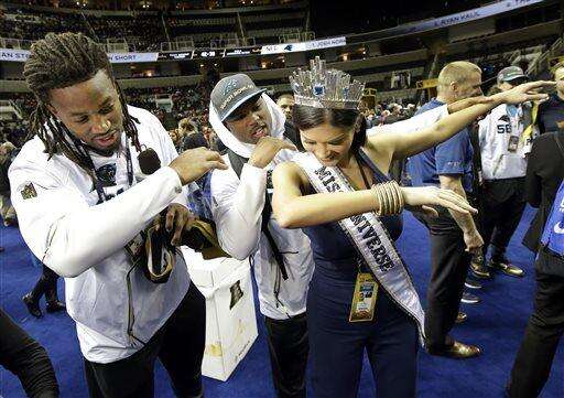 FILE - In this Monday, Feb. 1, 2016, file photo, Carolina Panthers' Ryan Delaire and Bene' Benwikere dance with Miss Universe Pia Alonzo Wurtzbach during Opening Night for the NFL Super Bowl 50 football game in San Jose, Calif. Whether it is Cam Newton photobombing his teammates getting off the plane at the Super Bowl, Mike Tolbert playing deejay in the team's locker room or teammates attending Star Wars movies together, the Panthers have, and continue to be, a loose, tight-knit bunch entering Super Bowl week.(AP Photo/Jeff Chiu, File) The Associated Press