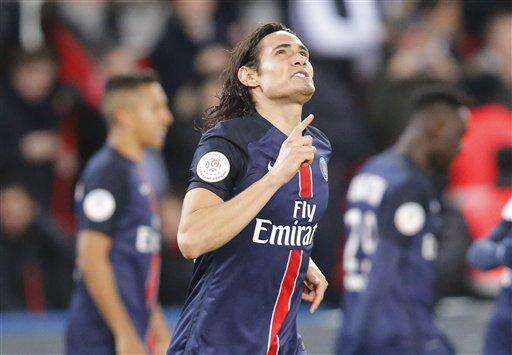 PSG's Edison Cavani, left, celebrates his opening goal with his teammates during a French League One soccer Match, Paris Saint Germain against Lorient at Parc des Princes stadium in Paris, Wednesday, Feb. 3, 2016. (AP Photo/Michel Euler) The Associated Press
