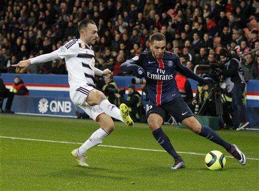 Lorient's Romain Philippoteaux, left, and PSG's Layvin Kurzawa challenge for the ball during a French League One soccer Match, Paris Saint Germain against Lorient at Parc des Princes stadium in Paris, Wednesday, Feb. 3, 2016. (AP Photo/Michel Euler) The Associated Press