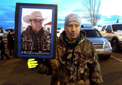 FILE - This Jan. 30, 2016 file photo shows Tony Atencio of Burns, Oregon, holds a photo of rancher Robert ``LaVoy'' Finicum at a rally against in Burns, Ore. The funeral for Finicum, killed by law enforcement during the armed occupation of an Oregon wildlife refuge was expected to draw supporters Friday, Feb. 5, from around the West to a small Utah town. (AP Photo/Nicholas K. Geranios, File) The Associated Press