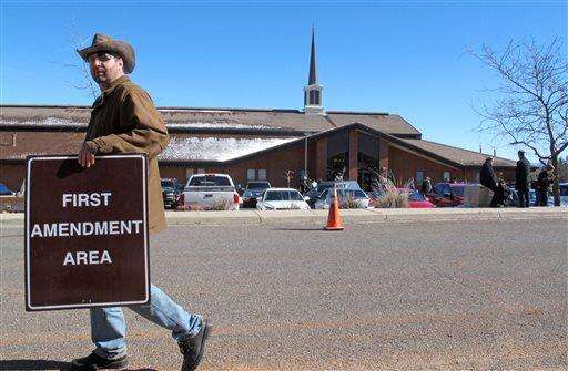 Greg Whalen, of Las Vegas, walks in front of the church in Kanab, Utah, where services were being held Friday, Feb. 5, 2016, for Arizona rancher Robert "LaVoy" Finicum. Hundreds of people packed a Mormon church in rural Utah for the viewing ceremony for the fallen spokesman of the Oregon armed standoff. Police shot and killed Finicum during a Jan. 26 traffic stop after they say he reached for a gun. His supporters called it an ambush.(AP Photo/Felicia Fonseca) The Associated Press