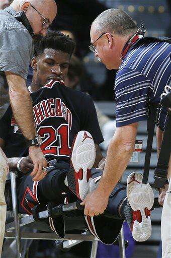 DENVER (AP) - Chicago Bulls guard Jimmy Butler was wheeled off the court late in the second quarter Friday night at Denver after apparently aggravating a left knee injury.