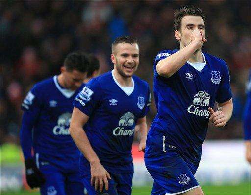 Everton's Seamus Coleman celebrates scoring his sides second during the English Premier League match at the Britannia Stadium, Stoke-on-Trent. England, Saturday Feb 6, 2016. (Mike Egerton / PA via AP) UNITED KINGDOM OUT - NO SALES - NO ARCHIVES