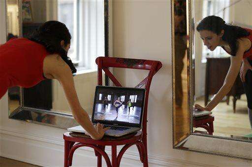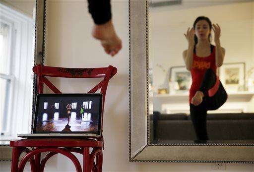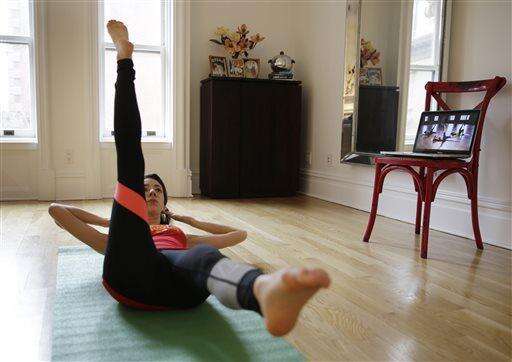 In this April 14, 2015 photo, Christina Macchiarola demonstrates how she uses the Crunch Live fitness app to work out in her apartment in New York. Crunch Live includes many of the workouts that earned the brand a devoted following and have been retired from their brick and mortar gyms. (AP Photo/Seth Wenig) The Associated Press